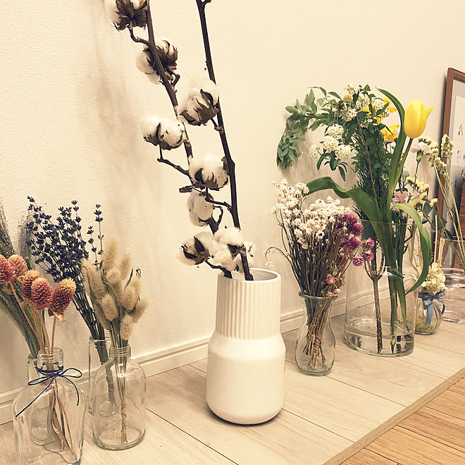 フラワーベース パンパスグラス コットンフラワー クラスペディア ユーカリドライ などのインテリア実例 03 28 54 40 Roomclip ルームクリップ